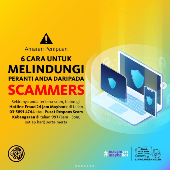 Leret ke kiri bagi mengetahui cara-cara untuk melindungi diri anda daripada penjenayah siber!💰💸 Sekiranya anda terkena scam, hubungi Hotline Fraud 24 jam Maybank di talian 03-5891 4744 atau Pusat Respons Scam Kebangsaan di talian 997(8am-8pm, setiap hari) serta-merta 📲🆘.